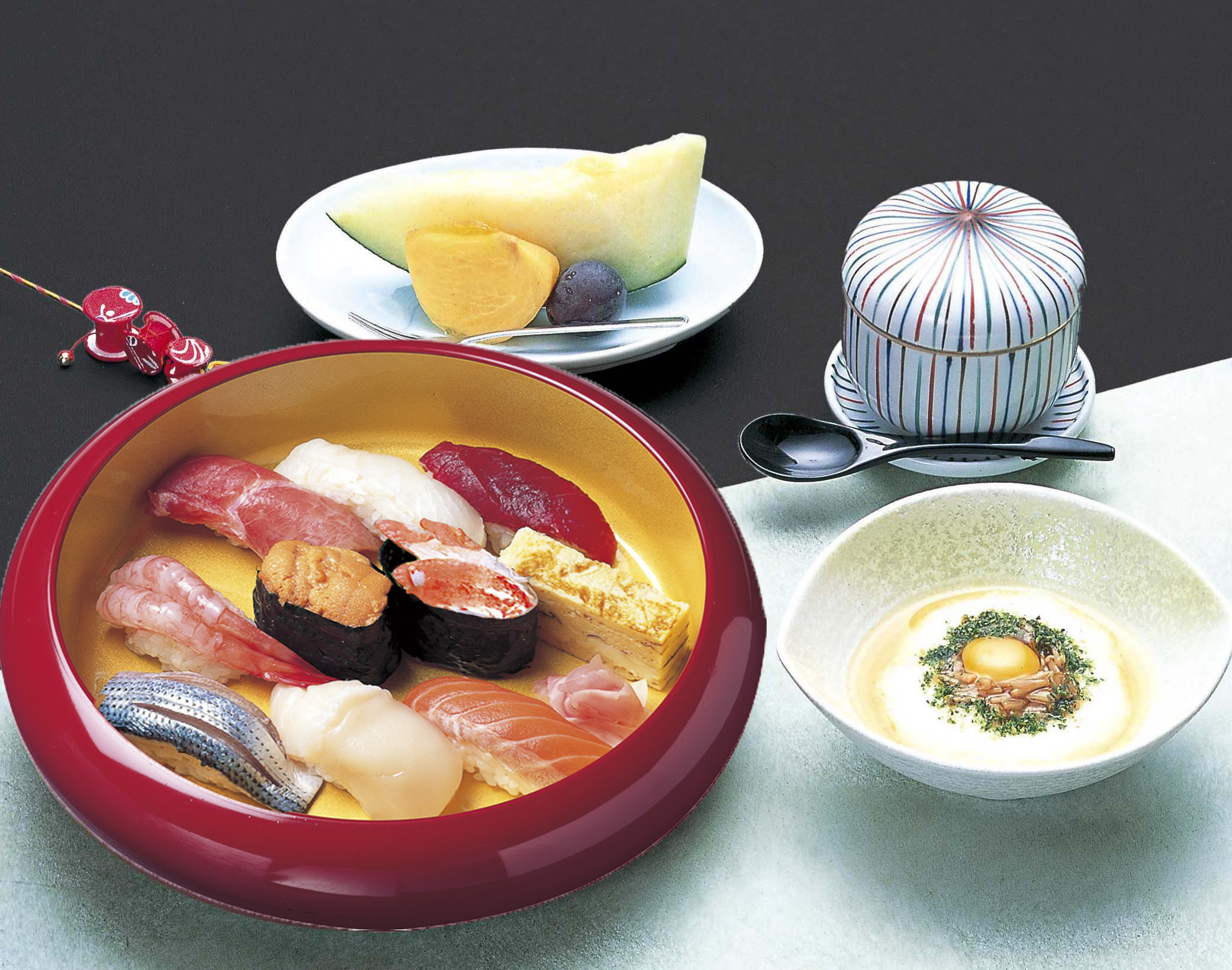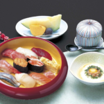 生の大トロと北海道のウニが魅力の「ふじ」に、茶碗蒸し、山芋、フルーツを加えたセットです。